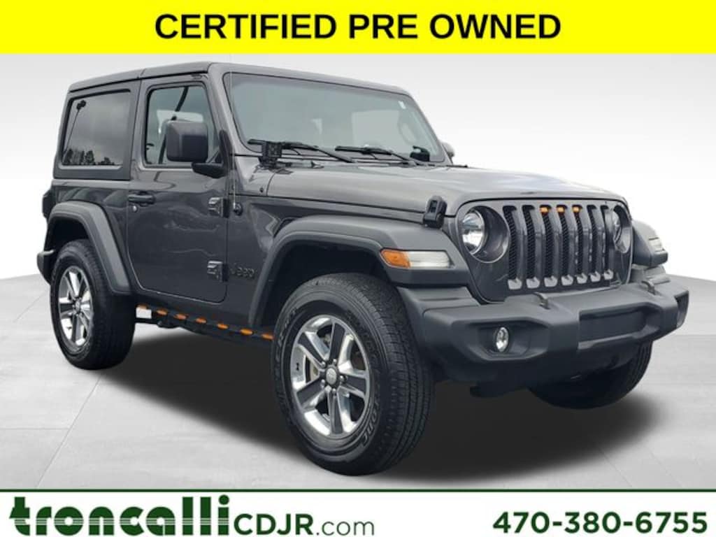 2023 Jeep Wrangler Sport S Certified. CARFAX One-Owner. FCA US LLC Certified Pre-Owned Details: * Limited Warranty: 3 Month/3,000 Mile (whichever comes, ** Bluetooth, ** Backup Camera, ** Apple Car Play / Android Auto, 3.45 Overall Top Gear Ratio, 4-Wheel Disc Brakes, 8 Speakers, ABS brakes, AM/FM radio, Apple CarPlay, Apple CarPlay/Android Auto, Automatic Headlamps, Auxiliary Battery, Black 3-Piece Hard Top, Brake assist, Cloth Low-Back Bucket Seats, Compass, Convenience Group, Deep Tint Sunscreen Windows, Delay-off headlights, Driver door bin, Driver vanity mirror, Dual front impact airbags, Dual front side impact airbags, Electronic Stability Control, Emergency communication system: SiriusXM Guardian, Engine Oil Cooler, Freedom Panel Storage Bag, Front 1-Touch Down Power Windows, Front anti-roll bar, Front Bucket Seats, Front Center Armrest w/Storage, Front fog lights, Front reading lights, Google Android Auto, GPS Antenna Input, Integrated Center Stack Radio, Integrated roll-over protection, Integrated Voice Command w/Bluetooth, Low tire pressure warning, MOPAR All-Weather Floor Mats, No Soft Top, Non-Locking Fuel Cap w/o Discriminator, Normal Duty Suspension, Occupant sensing airbag, Outside temperature display, ParkView Rear Back-Up Camera, Passenger door bin, Passenger vanity mirror, Power Heated Mirrors, Power steering, Premium Wrapped Steering Wheel, Quick Order Package 22S Sport S, Radio data system, Radio: Uconnect 4 w/7" Display, Rear anti-roll bar, Rear reading lights, Rear Window Defroster, Rear Window Wiper/Washer, Remote Keyless Entry, Security Alarm, SiriusXM Satellite Radio, Speed control, Speed Sensitive Power Locks, Sport S, Start-Stop Dual Battery System, Steering wheel mounted audio controls, Sun Visors w/Illuminated Vanity Mirrors, Tachometer, Telescoping steering wheel, Tilt steering wheel, Traction control, Trip computer, Universal Garage Door Opener, USB Host Flip, Variably intermittent wipers, Wheels: 17" x 7.5 Tech Silver Aluminum.