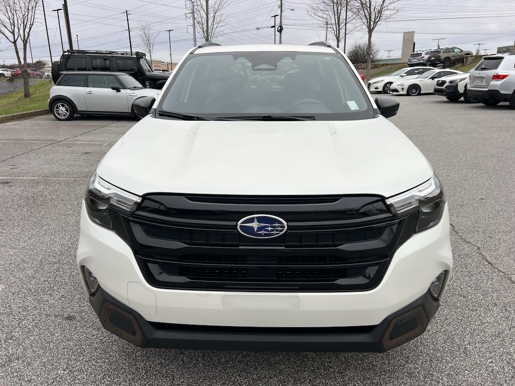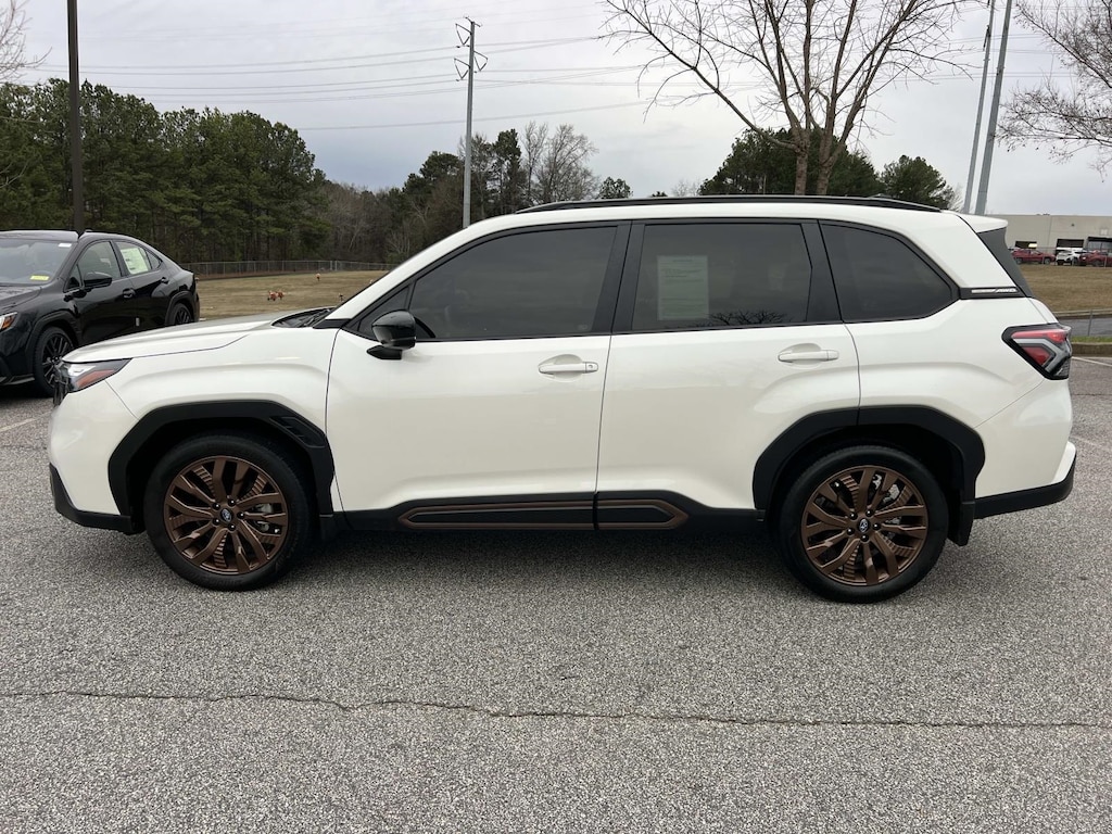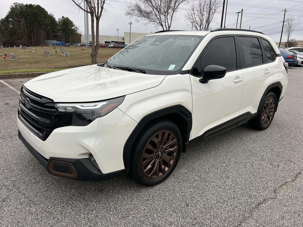 Certified. Crystal White Pearl 2025 Subaru Forester Sport AWD Lineartronic CVT 2.5L 4-Cylinder DOHC 16V New Feature, **Back up Camera, **Bluetooth, **Blind Spot Monitor, **Apple CarPlay, Forester Sport, 4D Sport Utility, 2.5L 4-Cylinder DOHC 16V, Lineartronic CVT, AWD, Crystal White Pearl, Gray w/Hexagonal Patterned Cloth Upholstery, 4-Wheel Disc Brakes, 6 Speakers, ABS brakes, Air Conditioning, All-Weather Floor Liners, Alloy wheels, AM/FM radio: SiriusXM with 360L, Anti-whiplash front head restraints, Auto High-beam Headlights, Auto-Dimming Exterior Mirror w/Approach Light, Auto-Dimming Mirror w/Compass & HomeLink, Automatic temperature control, Brake assist, Bumpers: body-color, Cargo Tray, Driver door bin, Driver vanity mirror, Dual front impact airbags, Dual front side impact airbags, Electronic Stability Control, Emergency communication system: MySubaru Safety (3-year free trial), Exterior Parking Camera Rear, Four wheel independent suspension, Front anti-roll bar, Front Bucket Seats, Front Center Armrest, Front dual zone A/C, Front fog lights, Front reading lights, Fully automatic headlights, Heated door mirrors, Heated Front Bucket Seats, Heated front seats, Illuminated entry, Knee airbag, Leather steering wheel, LED Upgrade, Low tire pressure warning, Occupant sensing airbag, Outside temperature display, Overhead airbag, Overhead console, Panic alarm, Passenger door bin, Passenger vanity mirror, Popular Package #2, Power door mirrors, Power driver seat, Power moonroof: Panoramic, Power steering, Power windows, Radio data system, Radio: Subaru 11.6" Multimedia Plus System, Rear anti-roll bar, Rear Bumper Cover, Rear seat center armrest, Rear Seatback Protector, Rear window defroster, Rear window wiper, Remote keyless entry, Security system, Speed control, Speed-sensing steering, Split folding rear seat, Spoiler, Sport StarTex Upholstery, Steering wheel mounted audio controls, Tachometer, Telescoping steering wheel, Tilt steering wheel, Traction control, Trip computer, Turn signal indicator mirrors, Variably intermittent wipers, Wheels: 19" x 7.5 J Bronze Finish Aluminum-Alloy.