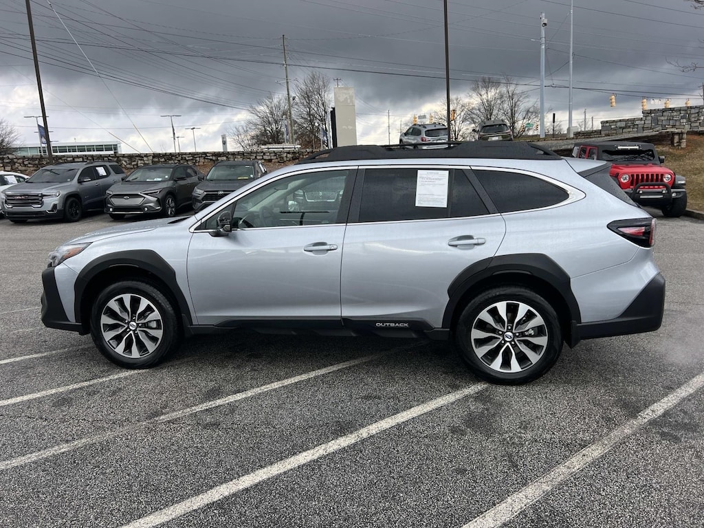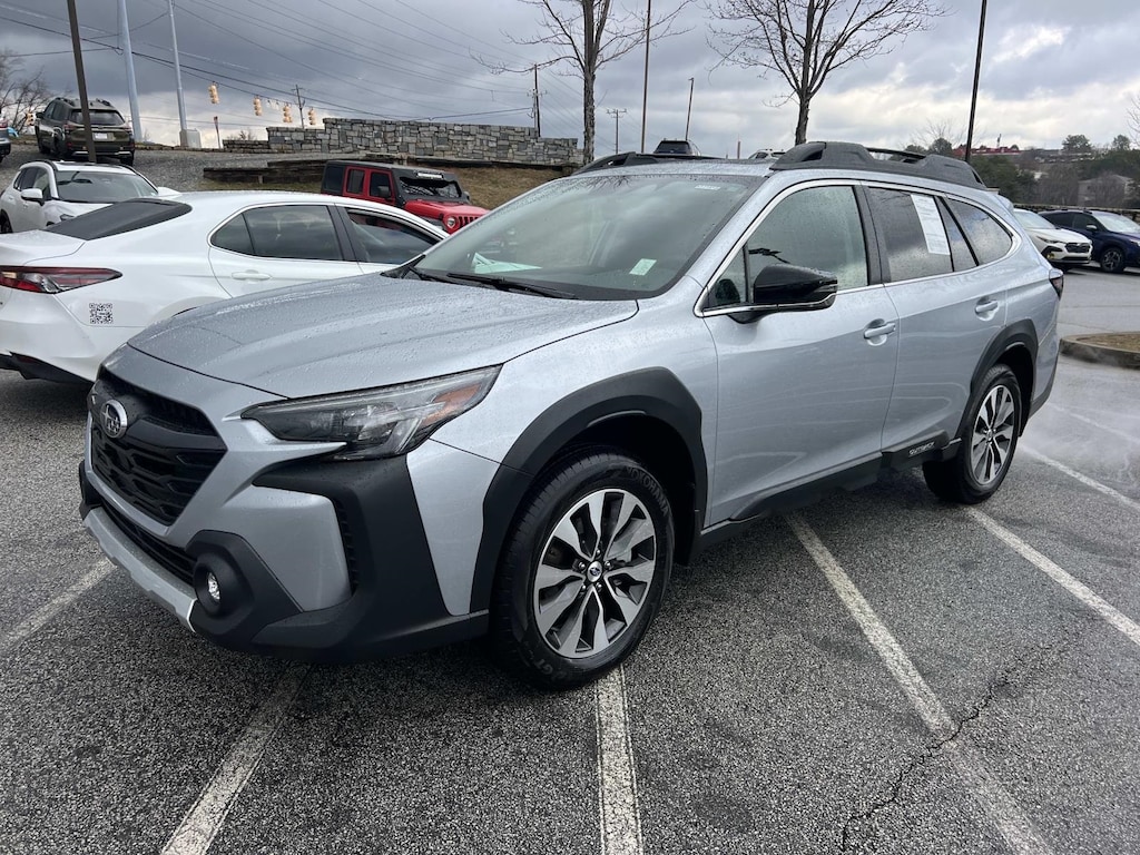 Certified. Ice Silver Metallic 2025 Subaru Outback Limited AWD CVT Lineartronic 2.5L 4-Cylinder DOHC 16V New Feature, **Back up Camera, Outback Limited, 4D Sport Utility, 2.5L 4-Cylinder DOHC 16V, CVT Lineartronic, AWD, Ice Silver Metallic, Black Leather, 12 Speakers, 4-Wheel Disc Brakes, ABS brakes, Air Conditioning, All-Weather Floor Liners, Alloy wheels, AM/FM radio: SiriusXM with 360L, Apple CarPlay & Android Auto, Auto High-beam Headlights, Auto-dimming Rear-View mirror, Automatic temperature control, Brake assist, Bumpers: body-color, Compass, Driver door bin, Driver vanity mirror, Dual front impact airbags, Dual front side impact airbags, Electronic Stability Control, Emergency communication system: MySubaru Safety (3-year free trial), Exterior Parking Camera Rear, Four wheel independent suspension, Front anti-roll bar, Front Bucket Seats, Front Center Armrest w/Storage, Front dual zone A/C, Front fog lights, Front reading lights, Fully automatic headlights, Garage door transmitter: HomeLink, harman/kardon® Speakers, Heated door mirrors, Heated Front Bucket Seats, Heated front seats, Heated rear seats, Heated steering wheel, HVAC memory, Illuminated entry, Knee airbag, Leather Shift Knob, Leather steering wheel, LED Upgrade, Low tire pressure warning, Memory seat, Navigation system: TomTom Navigation w/what3words, Occupant sensing airbag, Outside temperature display, Overhead airbag, Overhead console, Panic alarm, Passenger door bin, Passenger vanity mirror, Perforated Leather-Trimmed Upholstery, Power door mirrors, Power driver seat, Power Liftgate, Power moonroof, Power passenger seat, Power steering, Power windows, Radio: Subaru 11.6" Multimedia System w/Navigation, Rear anti-roll bar, Rear Bumper Cover, Rear Seat Back Protector, Rear seat center armrest, Rear window defroster, Rear window wiper, Remote keyless entry, Roof rack, Security system, Speed control, Speed-sensing steering, Splash Guards, Split folding rear seat, Spoiler, Standard Model, Steering wheel mounted audio controls, Tachometer, Telescoping steering wheel, Tilt steering wheel, Traction control, Trip computer, Turn signal indicator mirrors, Variably intermittent wipers, Wheels: 18" x 7J Black Aluminum-Alloy.