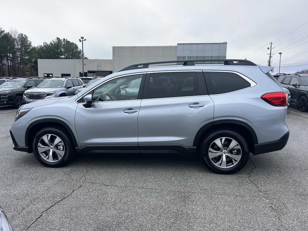 Certified. Silver 2025 Subaru Ascent Premium AWD Lineartronic CVT 2.4L 4-Cylinder DOHC 16V New Feature, **Back up Camera, **Bluetooth, **Keyless Entry, **Apple CarPlay, Ascent Premium, 4D Sport Utility, 2.4L 4-Cylinder DOHC 16V, Lineartronic CVT, AWD, Silver, 3rd row seats: bench, 4-Wheel Disc Brakes, 6 Speakers, ABS brakes, Air Conditioning, All-Weather Floor Liners, Alloy wheels, AM/FM radio: SiriusXM with 360L, Apple CarPlay & Android Auto, Auto High-beam Headlights, Auto-Dimming Exterior Mirror w/Approach Light, Auto-dimming Rear-View mirror, Automatic temperature control, Brake assist, Bumpers: body-color, Cargo Tray, Compass, Delay-off headlights, Driver door bin, Driver vanity mirror, Dual front impact airbags, Dual front side impact airbags, Electronic Stability Control, Emergency communication system: MySubaru Safety (3-year free trial), Exterior Parking Camera Rear, Four wheel independent suspension, Front anti-roll bar, Front Bucket Seats, Front Center Armrest, Front dual zone A/C, Front reading lights, Fully automatic headlights, Garage door transmitter: HomeLink, Heated door mirrors, Heated Front Bucket Seats, Heated front seats, Illuminated entry, Knee airbag, Leather Shift Knob, Leather steering wheel, LED Cargo Area Lighting, LED Upgrade, Low tire pressure warning, Occupant sensing airbag, Outside temperature display, Overhead airbag, Overhead console, Panic alarm, Passenger door bin, Passenger vanity mirror, Popular Package #2, Power door mirrors, Power driver seat, Power Liftgate, Power steering, Power windows, Radio data system, Radio: Subaru 11.6" Multimedia Plus System, Rear air conditioning, Rear anti-roll bar, Rear reading lights, Rear window defroster, Rear window wiper, Reclining 3rd row seat, Remote keyless entry, Security system, Speed control, Speed-sensing steering, Spill Resistant Coated Cloth Upholstery, Split folding rear seat, Spoiler, Steering wheel mounted audio controls, Tachometer, Telescoping steering wheel, Tilt steering wheel, Traction control, Trip computer, Turn signal indicator mirrors, Variably intermittent wipers, Wheels: 18" x 7.5 J Gray Alloy w/Machine Finish.