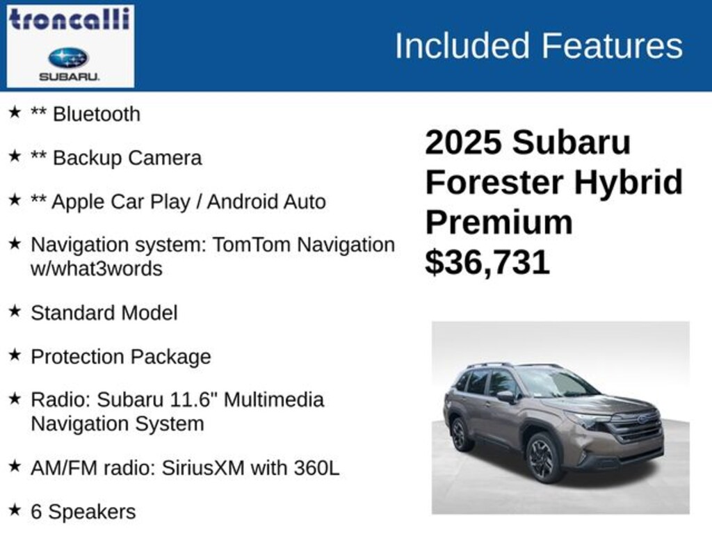 Discover the perfect balance of style, performance, and technology with this 2025 Subaru Forester Hybrid Premium. Visit our showroom today to take this exceptional vehicle for a test drive and see how it can elevate your driving experience.